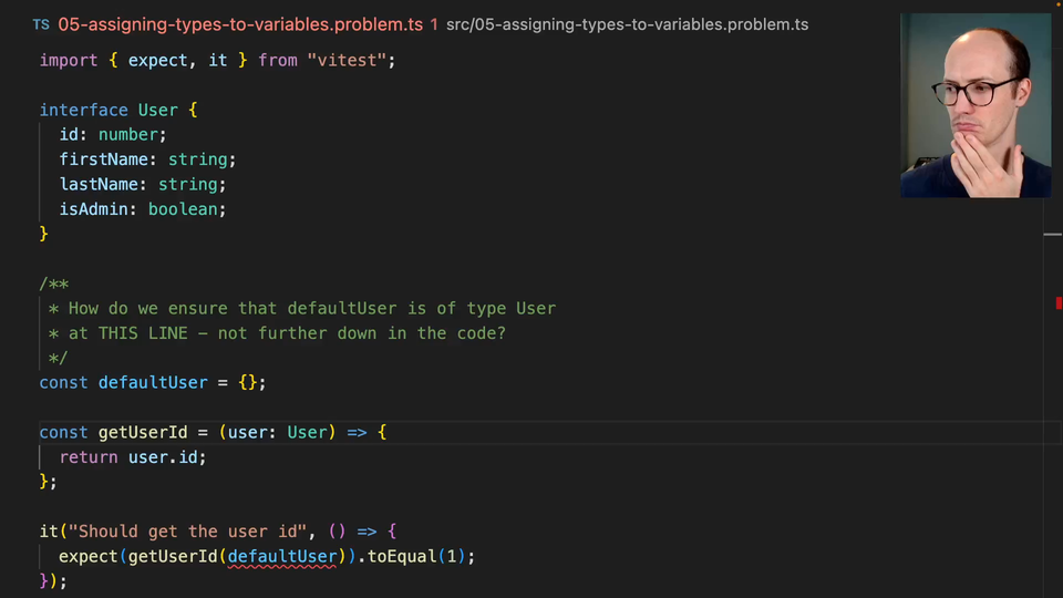 0:43 I don't want the error to be down here. I ideally want the error to be at this line or around here, because I want to make sure that my defaultUser is matching that user contract. Your job is to go through the TypeScript docs and work out how you would do this.