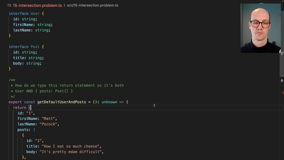 0:00 In this exercise I want you to find the return type for getDefaultUserAndPosts. We're typing it as unknown here, but what we really want it to be is user and an array of posts in a posts object here.