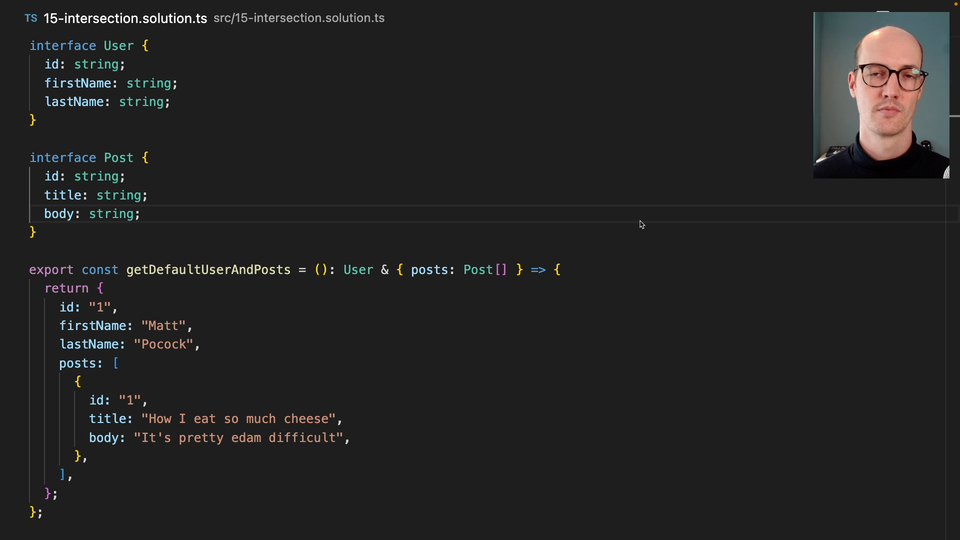 0:19 This is very similar to what we saw last time with extends. Except, with extends, you inherit. With intersection, you combine. You make type that is a combination of user and these posts down here. If I remove one of these, then this is going to yell at me. It's saying, "Object blah-blah blah-blah," because ID doesn't exist on just posts.