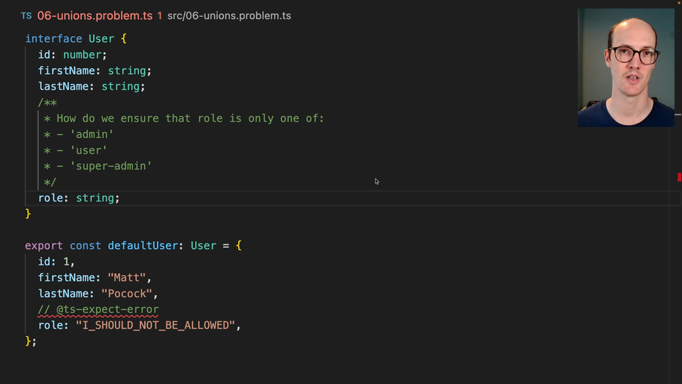0:58 It's a little useful trick that I've used just to make sure that you see that there's supposed to be an error on the next line. Workout using the docs to see if you can restrict role to be one of those three things.