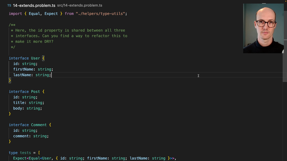 0:00 In this exercise, we've got a bunch of duplicated interfaces where they all share this ID property. We've got User, Post, and Comment. We've got a bunch of tests down here to make sure that everything stays as it should be. If I remove title from here, then it's going to yell at me because this Post type is not equal to id:string; title:string; body:string.