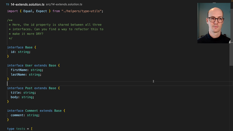 0:00 Now we have a base interface. This base interface, it contains our ID string, and now each of user, post, and comment will inherit from that base interface using extends.