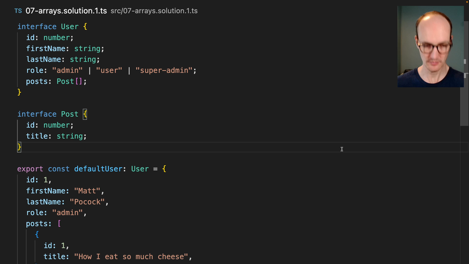 0:00 There are two solutions to this problem. The first one is to add a couple of square brackets just at the end of Post here. That turns it into an array of posts. I can extract this into a type itself. I can say const posts is Post array. Now, we get to specify all the array of posts, and I get my stuff all autocompleted for me, which is really, really nice. That's the first type of syntax you can use.