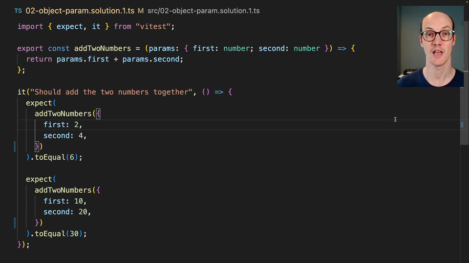 0:00 There are multiple solutions to this problem. The first one, and maybe one of the simplest to understand, is you can parse in an object type here direct to the params argument. Use these curly braces to represent and object, and then you create the type in line there.