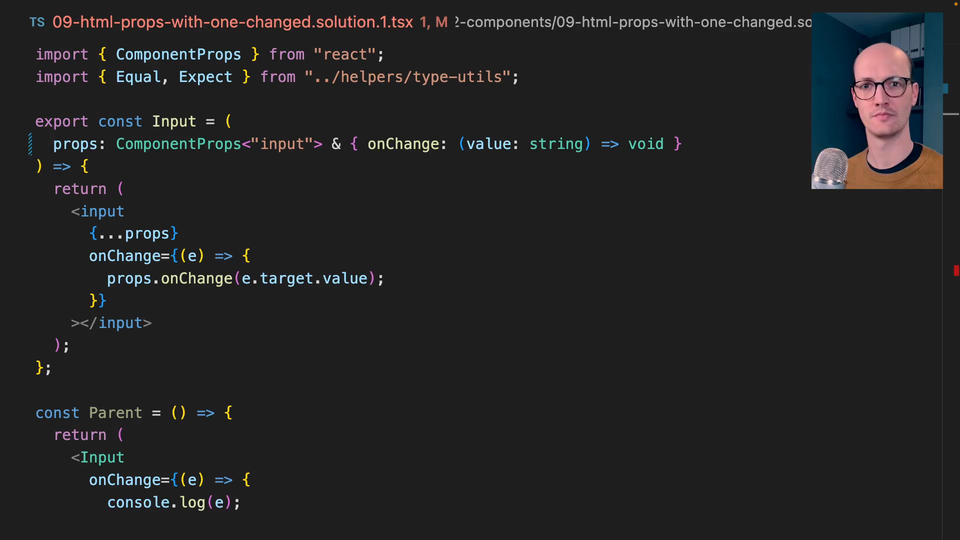 1:05 Let's now, to make this work, we need to wrap this in omit with onChange. Let's do that. Omit component props input onChange. Now because we're overriding it here, providing a new value to it, then everything works. This E is a string as we expect. If we remove this then we won't even be able to pass onChange because onChange isn't available in this omit component props.