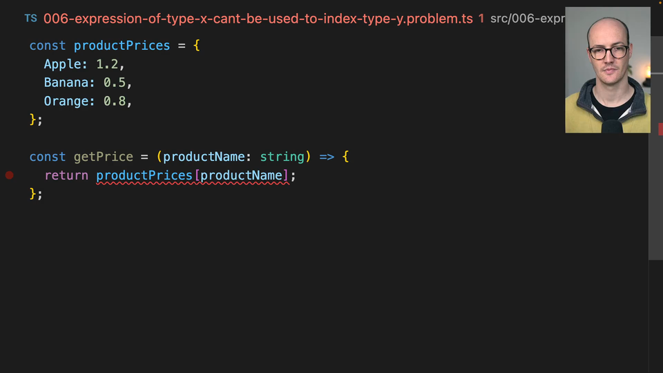 00:00 In this exercise, we have an object of product prices, apple, banana, and orange, and then we have a getPrice function. This, we have to pass in a product name here, and we return product prices product name. So we're indexing into product prices with the product name, which is string. And it says, element implicitly add on any type
