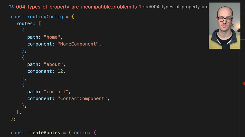 In this exercise, we have a routingConfig object which contains some routes. These routes are an array of objects, each with a path and a component property, both of which are expected to be strings: