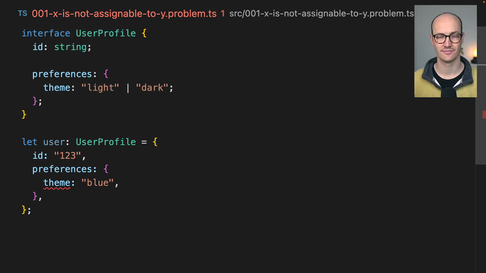 00:00 In this exercise we have a user object and we have an interface user profile. We are then assigning the annotating user with the user profile type and passing it some stuff. But we're getting an error down the bottom here. This error is saying type blue is not assignable to type light or dark.
