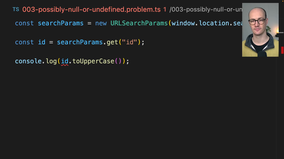 00:19 And then we're console logging it to ID two upcase. Your job is to work out why this error is occurring, ID is possibly null, and to figure out how we can make this better. There are a few ways of doing this. A couple are TypeScript only, a couple are runtime,