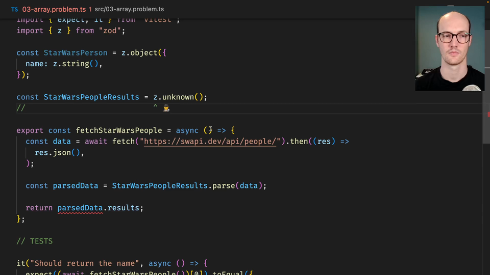 0:43 There are some other keys, too, like the count, like the results here. We've got to find some way of representing an array inside Zod because we need to reuse this StarWarsPerson.