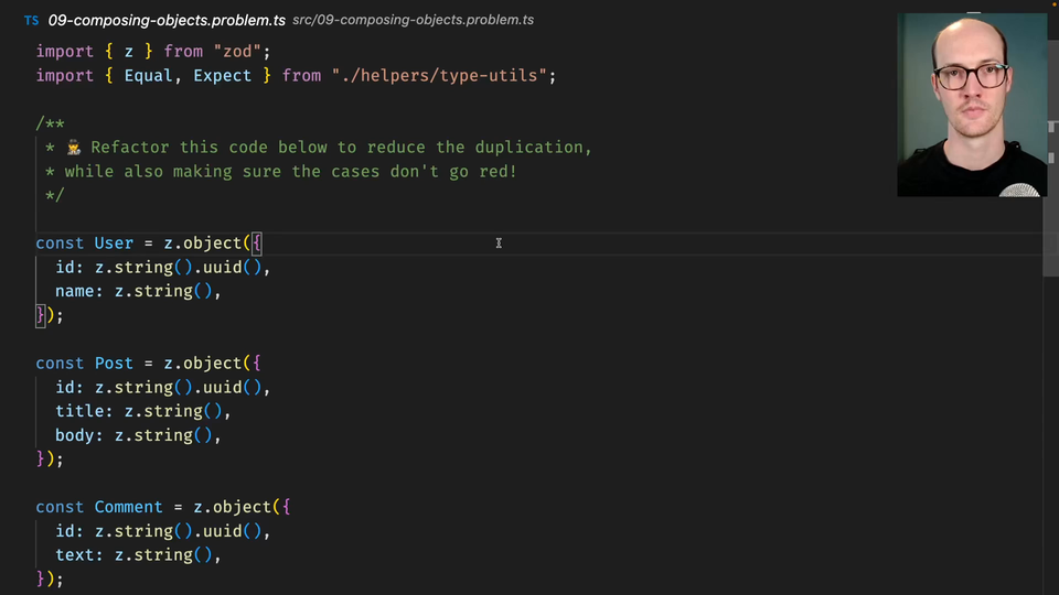 0:00 This exercise is a little bit different from the others because it's a refactor exercise. We've got some user and post and comment thing down here. What this is doing is there's a lot of duplicated code here. This ID is duplicated a bunch of times. There are various things in Zod that help you compose objects together into different types.