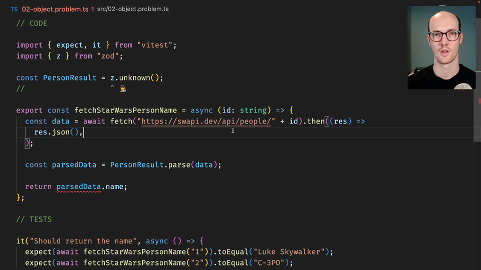 Matt Pocock: 0:00 We're now going to look at another really common use case in Zod, which is verifying unknown APIs. Here, we're calling an API inside fetchStarWarsPersonName, which is we're calling swapi.dev.API people. We're calling a res API endpoint, and then turning it into JSON.