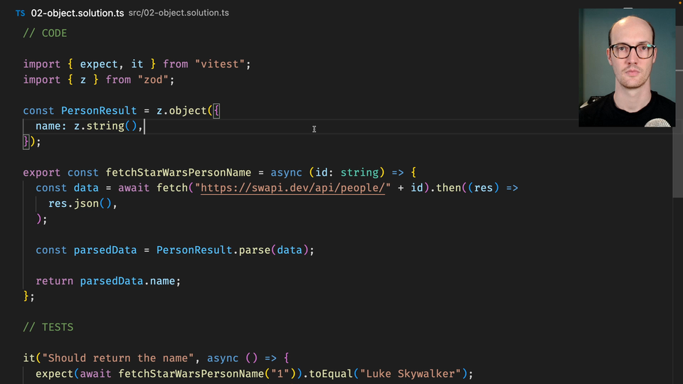Matt Pocock: 0:00 The solution here then is to change PersonResult here into a z.object. z.object is a tool that you can use to construct objects. It's like an interface in TypeScript. If we wanted to do the same thing in TypeScript, we would say, "PersonResultType." We'd say, "name string," here. You can see again how Zod really, really copies what TypeScript does. It does it very effectively.