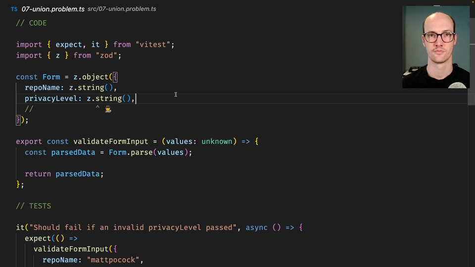 Matt Pocock: 0:00 Another day, another form. We are validating form inputs again, this time on a repoName, except that we've got this privacyLevel here. This privacyLevel, it's actually really only two types. It's going to be either private or public here.