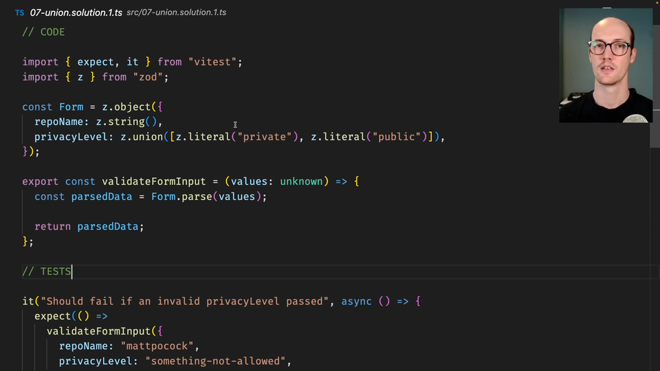 0:27 What you end up with is if we say type formType = z.infer<typeof Form>, then we end up with private or public here. If I were to add another one to this in z.literal...What's the one down here, something-not-allowed. Then, what you get is this test would fail, of course, because we're specifically saying this thing is not allowed. We've now allowed it inside our union.