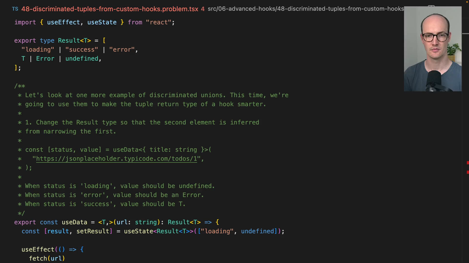 00:00 In this exercise, we have a UseDataHook and the UseDataHook returns a ResultTee. ResultTee is defined as a tuple with three different statuses in there. And we've got Loading or Success or Error. And here it's defined as either Tee or Error or Undefined.
