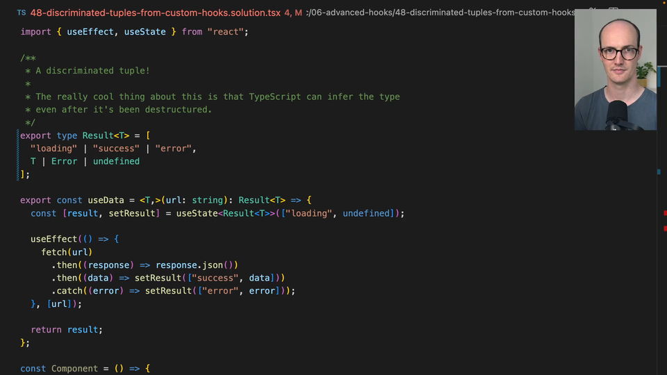 00:51 is it working? So, there's a few things to break down here. First of all, it's really smart that TypeScript understands that when you create this tuple, you get three different parts here, error, loading and success. I can't pass in an error, obviously, into success
