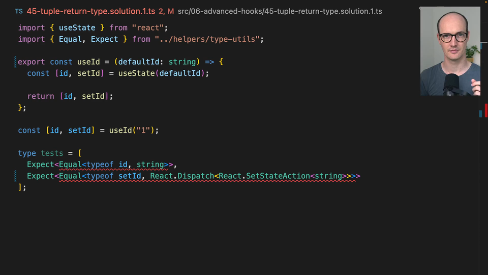00:33 This SetID is a string or the dispatch, and this one is an ID, string or dispatch. So the key here is to make TypeScript understand that the thing we're returning from this is not going to change, it's not going to be appended to, right? Because if you think about this, we've just basically got an array here, right?