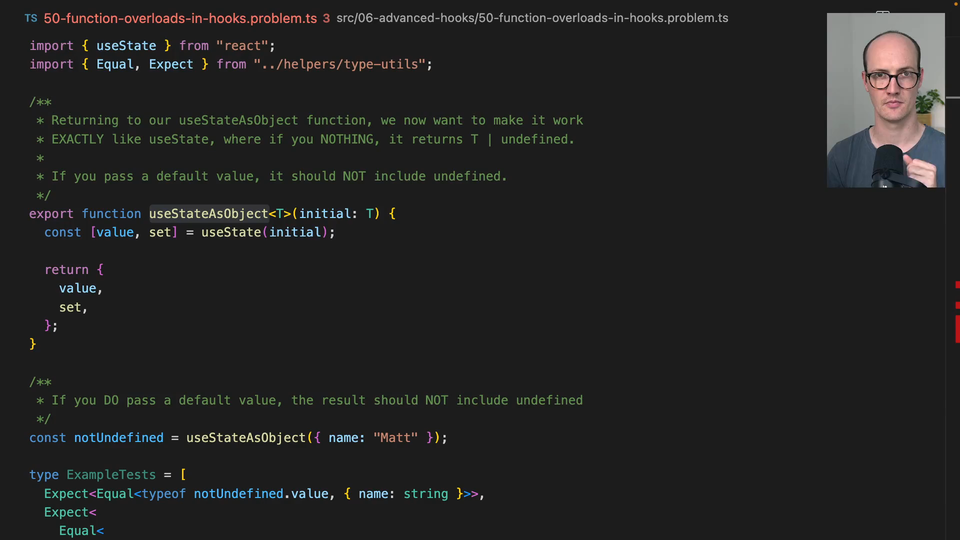 00:00 We first saw our useStateAsObject function back in the generic section. But here, what we want to do is we want to make it behave exactly like useState. Now, we want to actually mimic all of the overloads on useState, but also kind of mimic the generic signature here, too.
