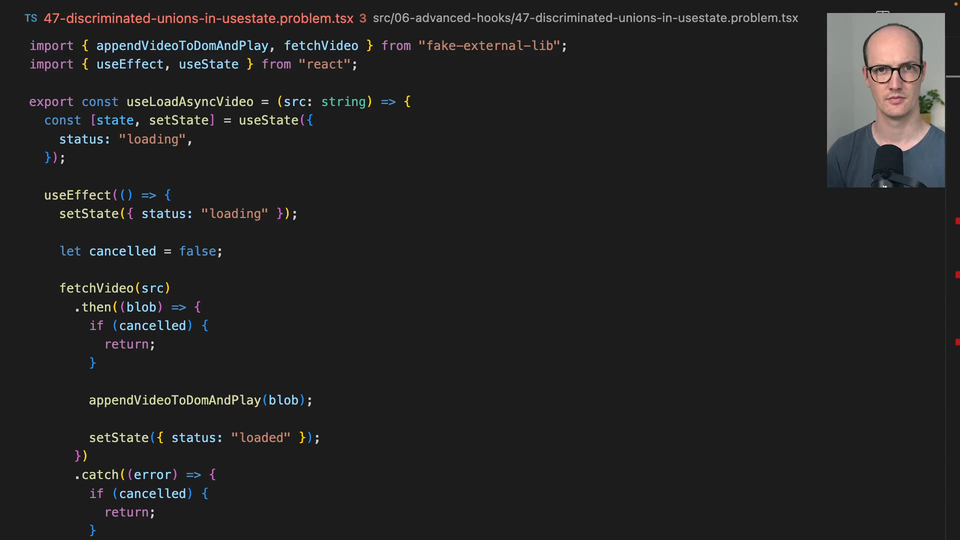 00:00 In this exercise, we're back with our UseLoadAsyncVideo hook, except we've decided to go for a slightly different representation of how this useState works. Instead of just having loading in there or loaded in there, we're actually now using an object with status Loading.