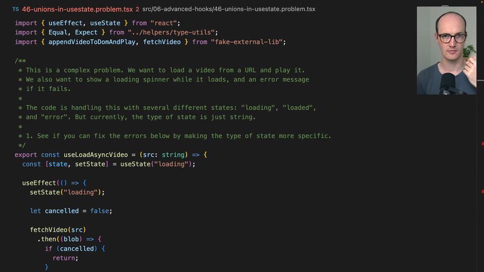 00:00 Here, we're going to look at how you can use TypeScript to make complex state a little bit easier to deal with. We have a Use Load Async Video hook. What this hook does is it basically, in a use effect, you can pass it a source, which is the source of the video you want to load. What it's going to do is it's going to fetch the video via the source and return a blob.