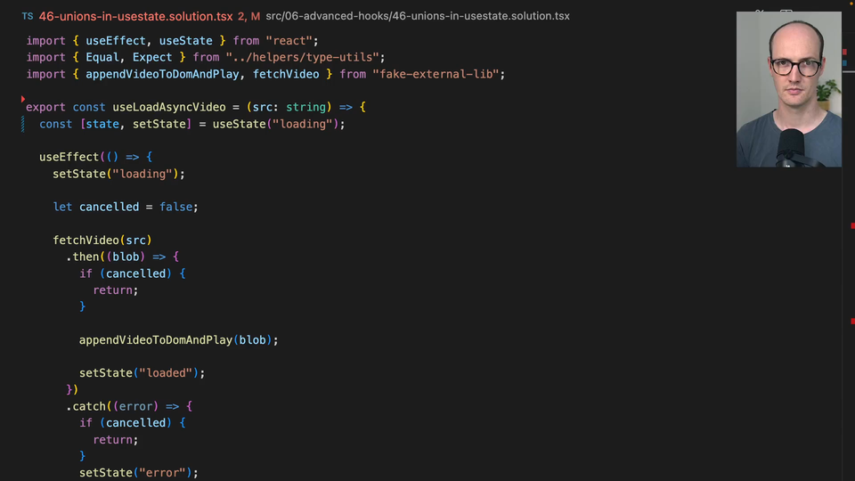 00:00 So, the solution is pretty simple here. When we declare this state up here, it gets declared as String. Now, what we really want is for this actually to be a union of a few different things. We want this to be a union of Loading, Loaded or Error. These are the three different things that this should be.