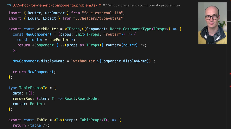 00:19 and this Table function is basically being wrapped with WithRooter here, and we've seen this Table component a bunch of times in this section actually. This wrapped Table then is not actually a generic component anymore. This one is, this Table was, but it's actually erroring because Rooter is required.
