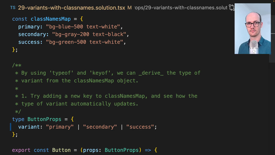 01:13 We could even just extract this into its own type here, ClassNamesMap type. And then type keys equals keyOf ClassNamesMap type. Can't type. There we go. Now these keys then are primary or secondary or success.