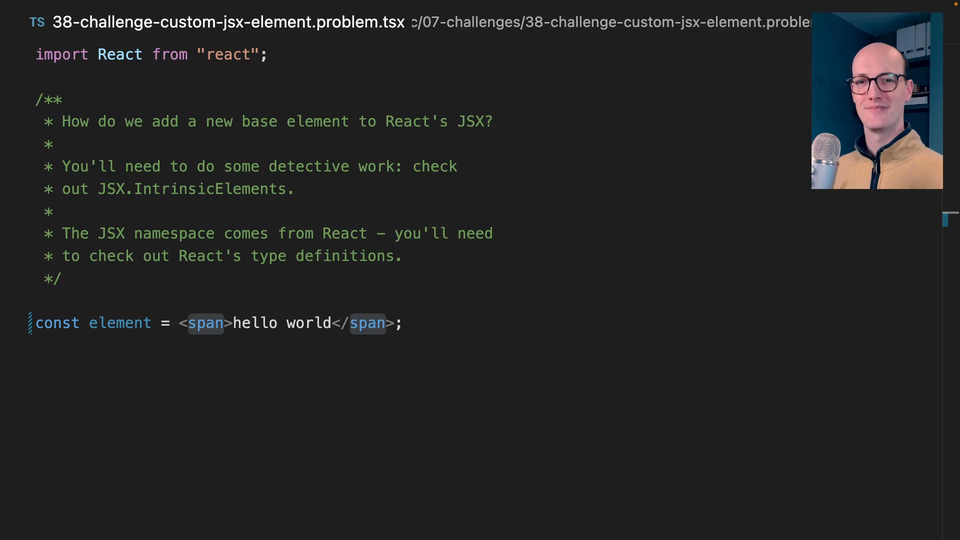 0:41 You're going to need to do a bit of investigation here to dive into React typings to see if you can figure out where, for instance, JSX.IntrinsicElements even lives and how you can possibly, from this file, add in a new type to it. You'll need a bit of the knowledge that you picked up in the globals section and also the external libraries section. Good luck.