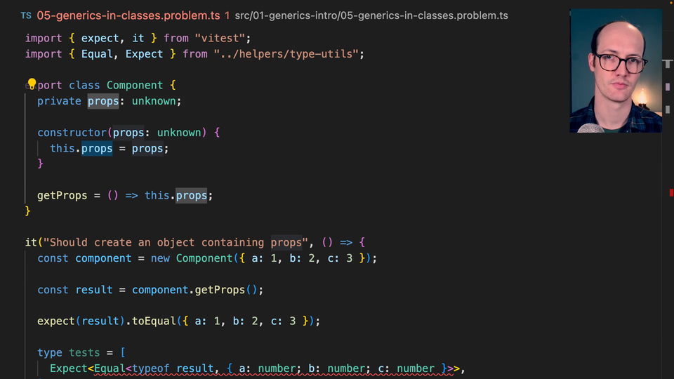0:00 Let's look at classes next. We have a Component class here that has a props attribute which is currently being typed as unknown. Inside the constructor, you have to pass it props. It then assigns props that you pass in, and it has a function that returns getProps.