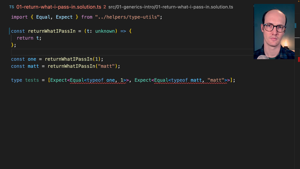 1:05 You can see, "Return what I pass in." We can actually see the thing that's being passed in, param is mat. It returns mat. You notice that I don't actually have to annotate the return type here. I can annotate it like this. I can say, "T gets returned here." I don't need to because TypeScript understands that param is T.