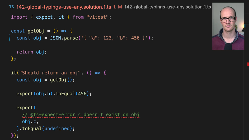 00:16 Because if we look here, obj is now of type any. This means that we can access anything on it, we can actually do anything with it. And we've kind of shut down type checking in various parts of our codebase just by calling this function. So this is a little bit dangerous. Now, how do we solve this?
