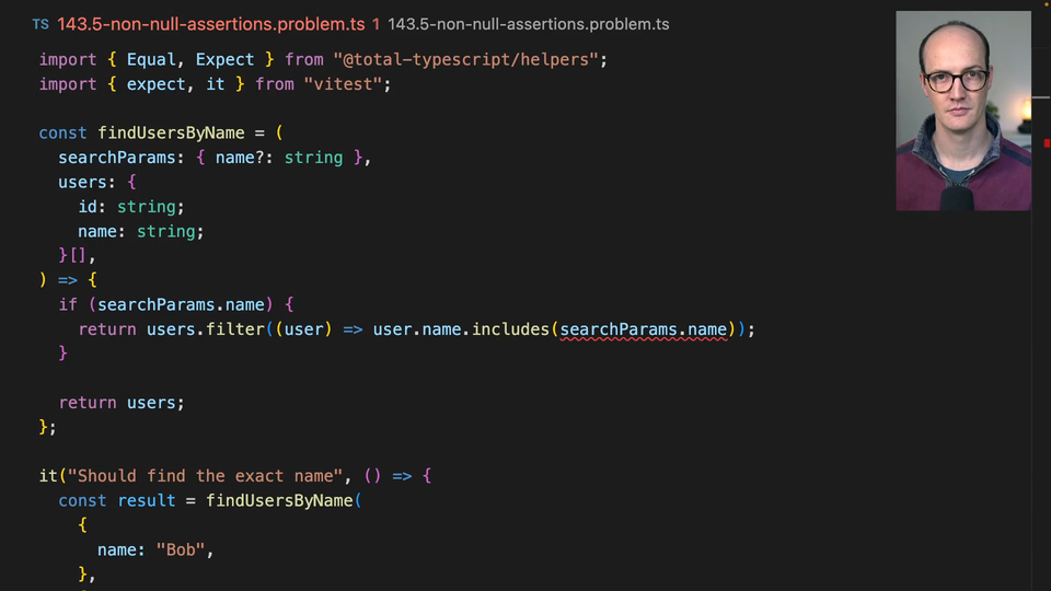 00:35 Your job is to try to figure out how we can use an assertion to actually make this error go away. We previously solved this exercise by extracting searchParams.name into a const variable and then doing the check on that, and that works fine.