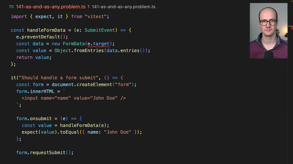 00:46 And really, we actually only want to change this line of code, the const Data equals new FormData E.target. And I think what we're going to need to do here is give TypeScript more information, annotate with intention, making sure that we're actually saying, OK, this target, it's not what you think it is.