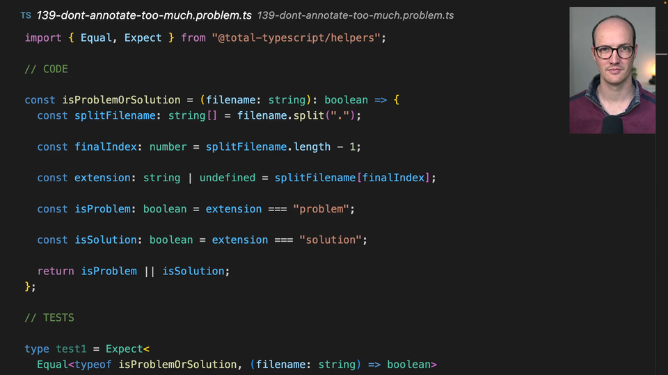 00:00 In this exercise, I want to investigate how many annotations you actually need to make TypeScript understand what you want. So we have here a isProblemOrSolution function which has a bunch of annotations. It has a return type annotation, it has an annotation on split file name, on final index, on extension, on isProblem, on isSolution.