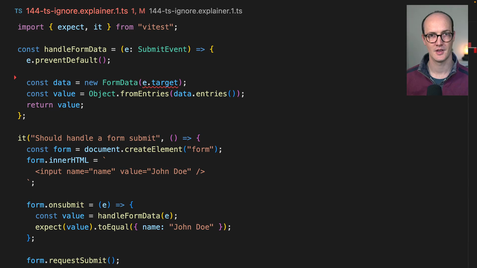 00:18 that are happening on the next line down. So ESLint has ESLint disable next line. And TypeScript has something similar. We have a handle form data function here, which takes in an E of submit events. We've seen this set up before. And then on E, we're passing E.target to new form data. But this is erroring because event target