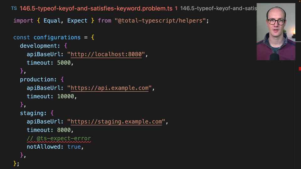 00:00 Here, we're back with our configurations object, which has development, production, and staging members of that object. We are basically saying type environment is key of type of configurations. We have development and production and staging being inferred from this. But we're expecting an error when we pass