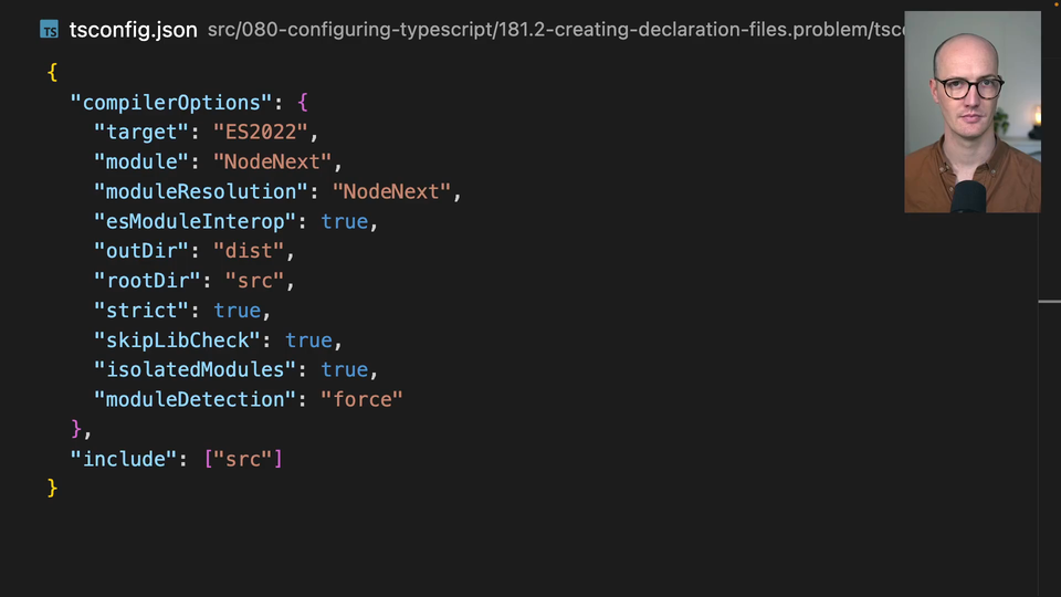 00:55 So your job is to work out how to configure this tsconfig.json file to build or create declaration files whenever it runs. We've got module node next, module resolution node next, and no emit is set to false, so everything should all be working.