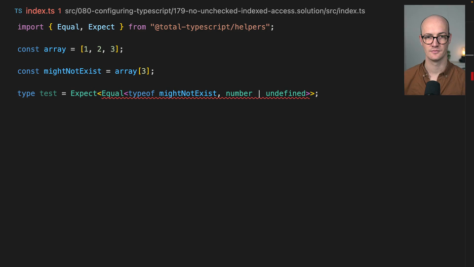 00:18 And now when we add that back in then if we look at index.ts might not exist is now number or Undefined look at that if there was a string inside here like this, then we would get string or number or undefined Okay, very interesting typescript is making our code a little bit safer here