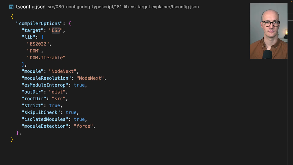 00:19 and the ones in DOM.iterable. But we can set target to something different from this. It doesn't have to be synced between lib and target. So we can say that when we transpile our TypeScript, we want to actually put it in this old syntax, ES5,