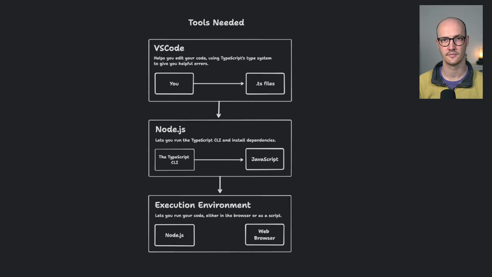 00:00 Let's break down all of the tools you're going to need to work with TypeScript. So you will need, first of all, an IDE, an Integrated Developer Environment. This is kind of like VS Code is a great example. VS Code is the one that I use. It's also distributed by Microsoft and it has a really great integration with TypeScript.