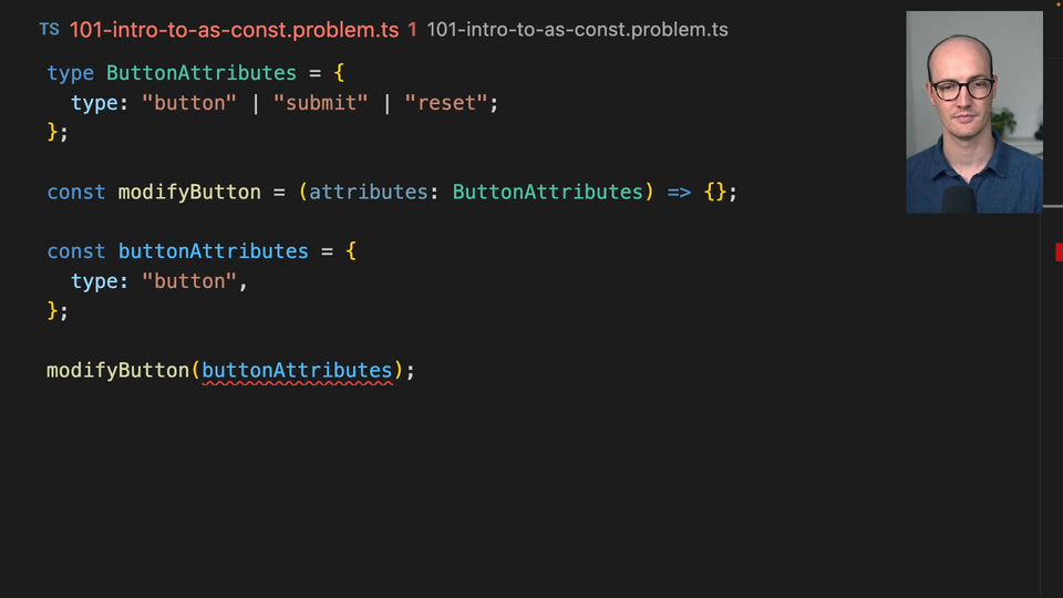 00:00 Okay, we have a very similar setup to what we had before, which is we have a modifyButton function which takes in some attributes. These attributes are typed as button attributes, so type button, submit or reset. Then we have a const down here of button attributes, and it says type button in there, but when we pass that into our function, it's not working because argument of type string