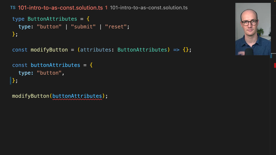 01:01 apart from if you're using a couple of features, which we'll talk about way further down the line. But just by adding this type annotation, you get read-only on it. So if I say ButtonAttributes.type equals whatever, it's not going to let me do that. And it infers the literal. AsConst. Very, very useful, as we'll see.