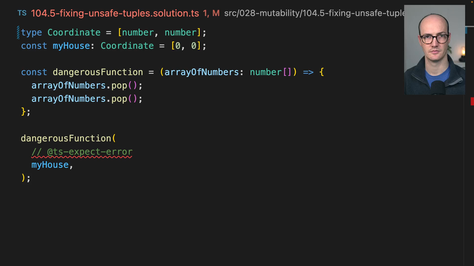 00:51 available. We cannot assign to one because it's a read-only property. We can't push to it. We can't say my house.pop, for instance, not even available on a read-only array. This means that these read-only tuples are a lot safer. And we actually get an error down the bottom here, which is argument of type coordinate is not assignable to parameter of type number.
