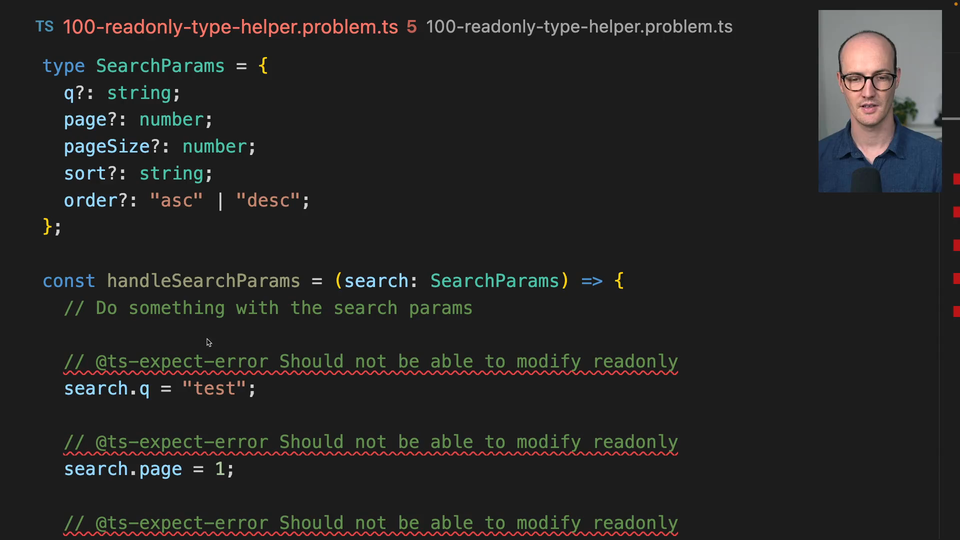 00:37 Now, of course, we could go up and sort of add read-only onto all of these. That's nice. But there is a type helper that can help us out, which can apply itself to search params and make sure that all of the properties are read-only. Good luck in trying to find it.