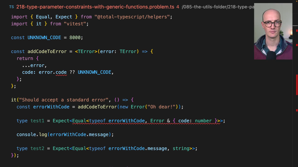00:00 In this exercise, we're going to look at constraints in type parameters in generic functions. We have an addCodeToError function here, which is taking in a type parameter of tError. And then it's basically saying the thing that we're passing in is going to be tError. Error is tError.