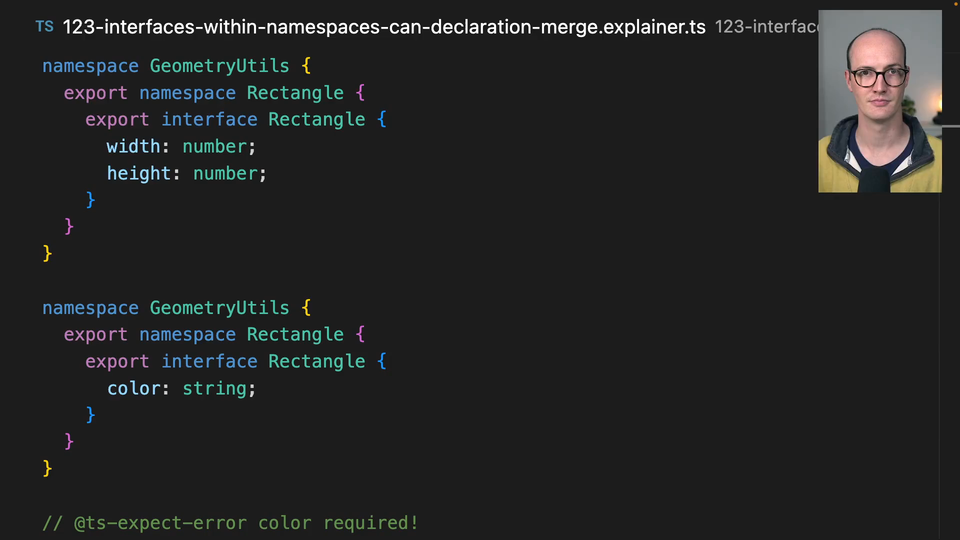 00:00 You've heard of interfaces, declaration merging. You've heard of namespaces, declaration merging. Well, how about interfaces within namespaces, declaration merging? I mean, why not, right? We have our geometry utils. And in this one, we have our export namespace rectangle