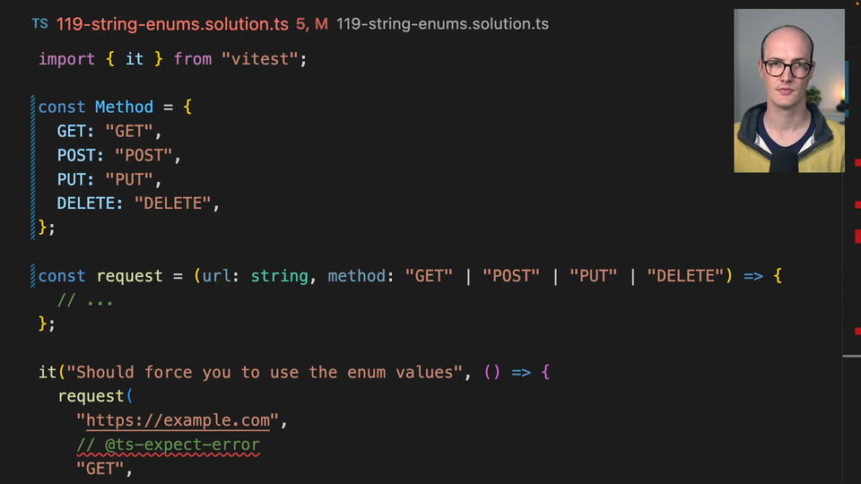 02:10 that you would have to import this specific enum for this specific case. Whereas I would usually prefer to just say get or post or put or delete. That seems fine to me. But for those of you who are disagreeing with me, who say, yes, this seems fantastic, then string enums are there for you to use.