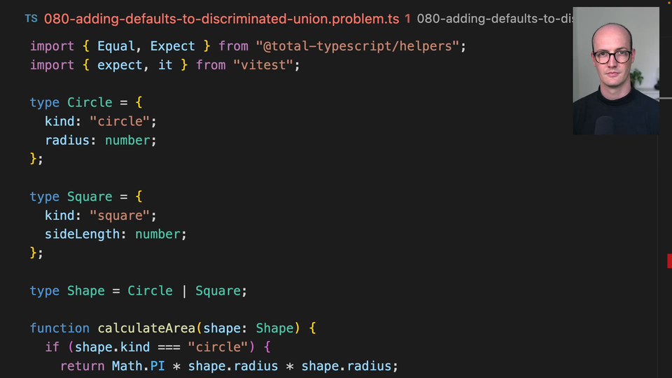 00:17 then it should calculate the area properly using a discriminated union. But down here in the calculateArea function, it should calculate the radius when we don't pass in a member of the discriminated union, when we don't pass in a kind. So here we're sort of implicitly