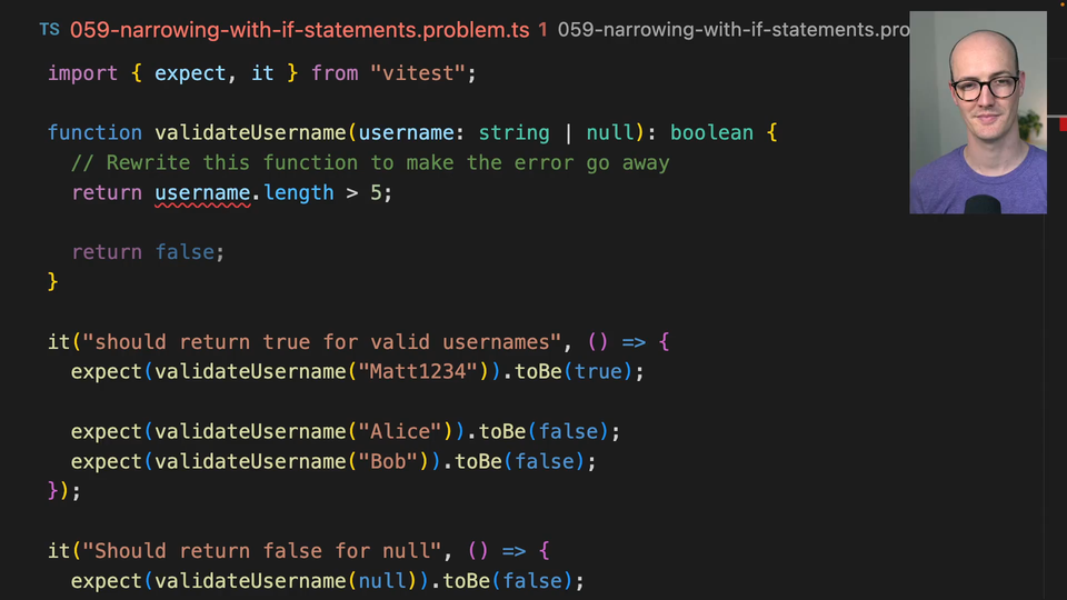 00:00 In this exercise, we have a couple of things going wrong. We have a validate username function here where we can pass in either string or null and it's going to always return boolean. We've added a return type to make sure it does. Now, what we can see is in the tests here, if we pass in some strings here, then it should basically check to see if the username length is more than five.